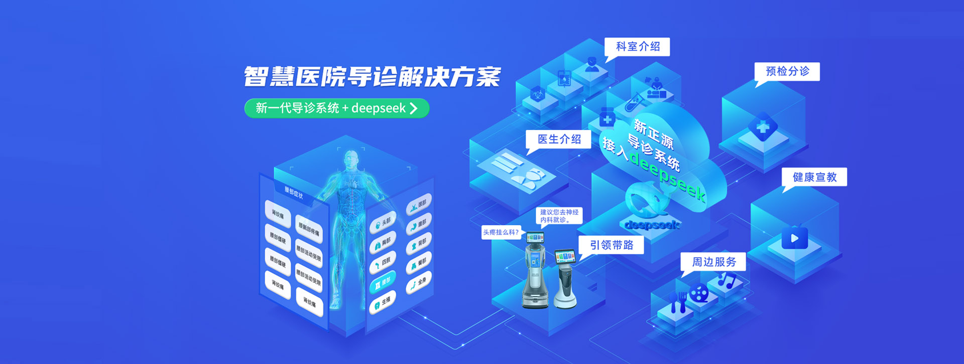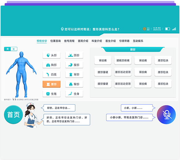 機器人設置了預檢分診功能,即當患者想了解自己癥狀所需要掛的科室信息,除了語音直接詢問,也可以點擊模塊中展示的人體模型,可以直接點擊身體的部位,選擇癥狀情況,機器人會自動判斷給出科室建議。