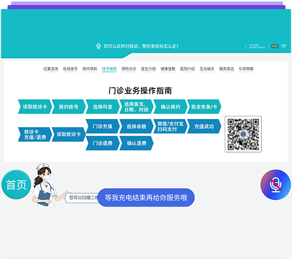 機器人展示端預留了掛號與支付窗口,可直接嵌入現有的支付掛號的APP或二維碼,無需對接醫院的HIS系統,輕松實現掛號與支付。