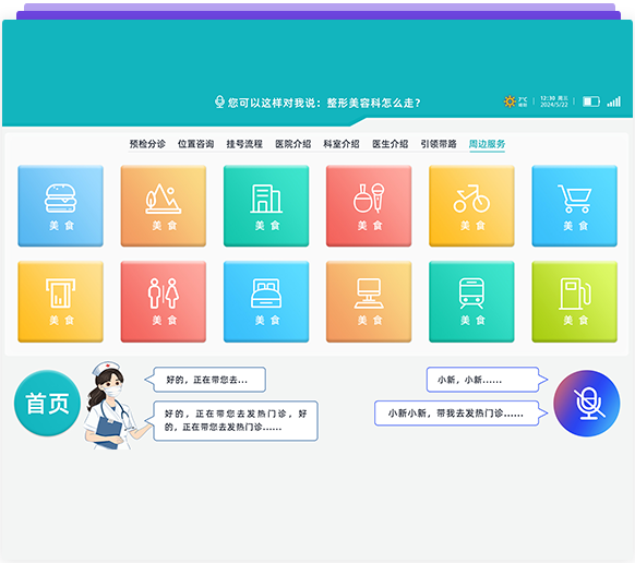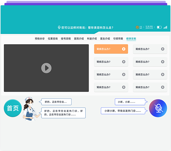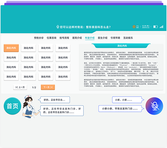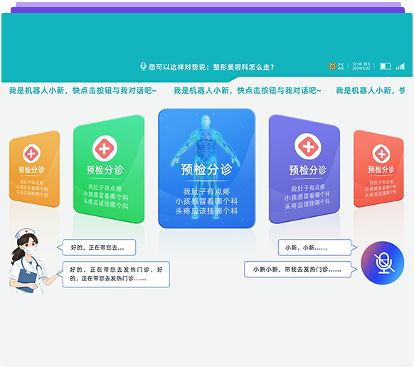 智能語音識別(關鍵字,語義雙重識別方式),導醫系統已經覆蓋了40個科室中的6000多種常見病,并且搭載了智能自診、智能導診、智能預問診、智能問答等板塊功能,可以自主回問題;用戶可以自行添加、修改知識庫?。語音對話和控制:人與機器人交流,不單純靠固定語句,可以智能回答問題——人與機器人可以隨意交流;也可語音控制機器人到達指定位置,例:我感冒了掛什么科?機器人通過專業醫療知識及大數據分析告知你準確的科室。