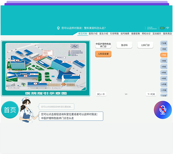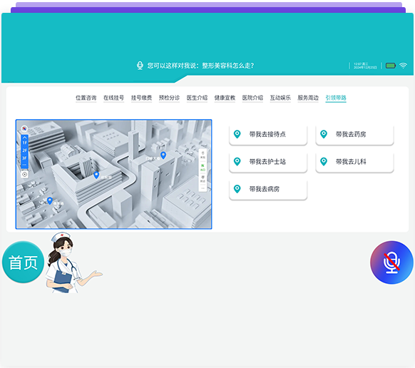 導診機器人配置了位置引領功能,語音或點擊要了解的科室位置,機器人會把行走的路線告知你,并配置平面& 3D地圖(接入院內導航系統),展示行走的路線圖;如是在同一樓層,機器人可以帶到你去要到的地方。